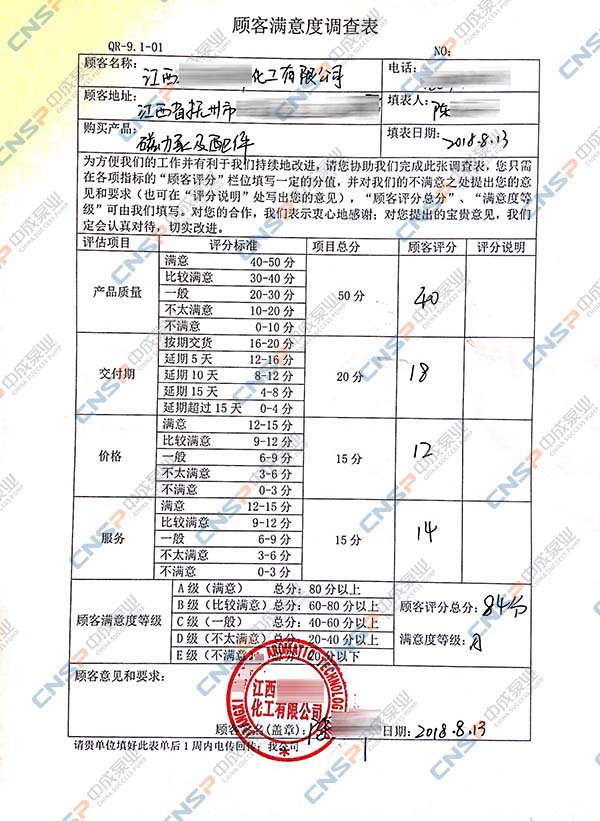 中成泵业从我们的多级泵、计量泵等产品的客户中抽选几名进行表格内容调查,客户反馈成绩均为A级,其中螺杆泵、磁力泵、隔膜泵等客户纷纷表示希望保持合作并对我们的产品持有期望。